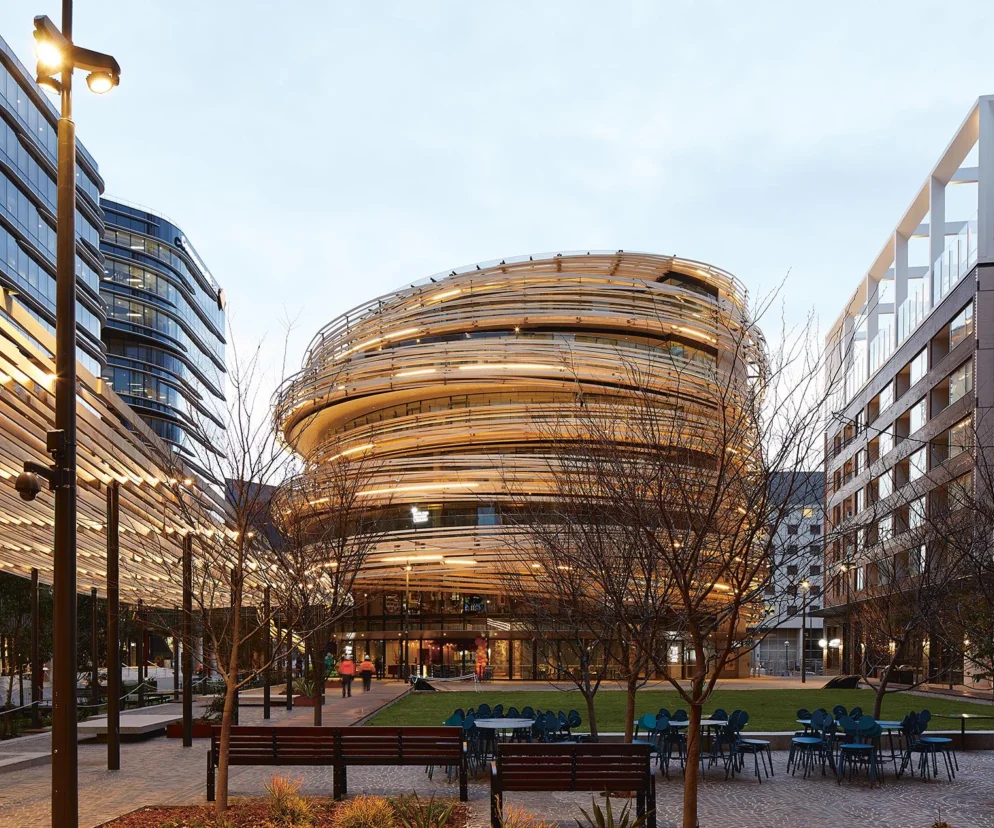Na sześciu całkowicie przeszklonych kondygnacjach znalazły się m.in. świetlica, biblioteka, restauracja czy miejsce do pracy dla lokalnych start-upów. Eliptyczne piętra mają różne średnice, przesunięte względem siebie tworzą dodatkowe tarasy lub mocno wysunięte okapy. Całkowicie przeszklone fasady przykrywają ażurowe elementy z giętkiego drewna Accoya. To nie gatunek drewna, a nazwa własna produktu – drewna acetylowanego, czyli poddanego specjalnej obróbce. Dzięki temu materiał zwiększa swoją wytrzymałość na wpływ czynników atmosferycznych, w tym wody i promieni UV.