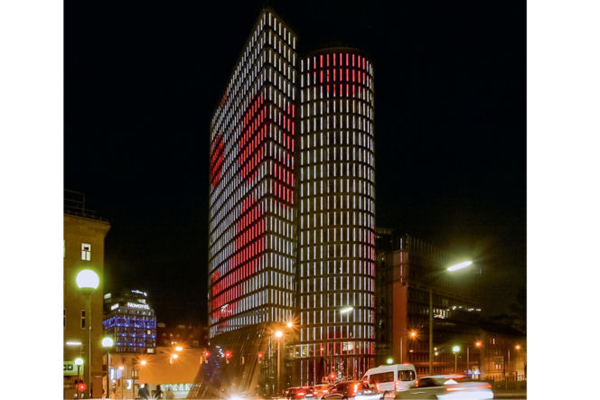 Elementy oświetleniowe ukryte w fasadzie osłonowej biurowca Uniqua Tower