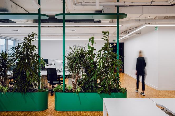 W aranżacji biura nie zabrakło też dużych kwietników. Rośliny nie tylko podnoszą wilgotność powietrza, lecz także poprawiają komfort akustyczny