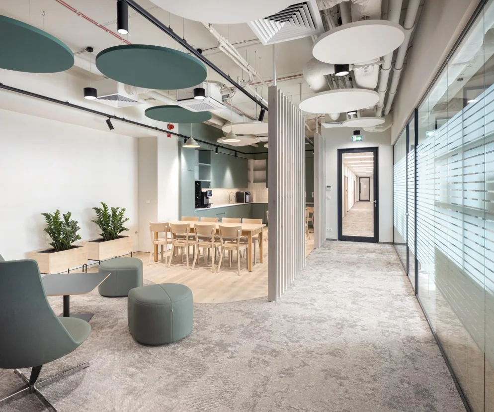 Projekt uwzględnia także rozwiązania zrównoważone. W przestrzeniach biurowych zastosowano wykładzinę dywanową o niskim śladzie węglowym, z ponad 53-procentowym udziałem materiałów z recyklingu i pochodzenia naturalnego, a także przędzę i podłoże w pełni nadające się do recyklingu. Całość uzupełnia energooszczędne oświetlenie LED oraz filcowe elementy PET.